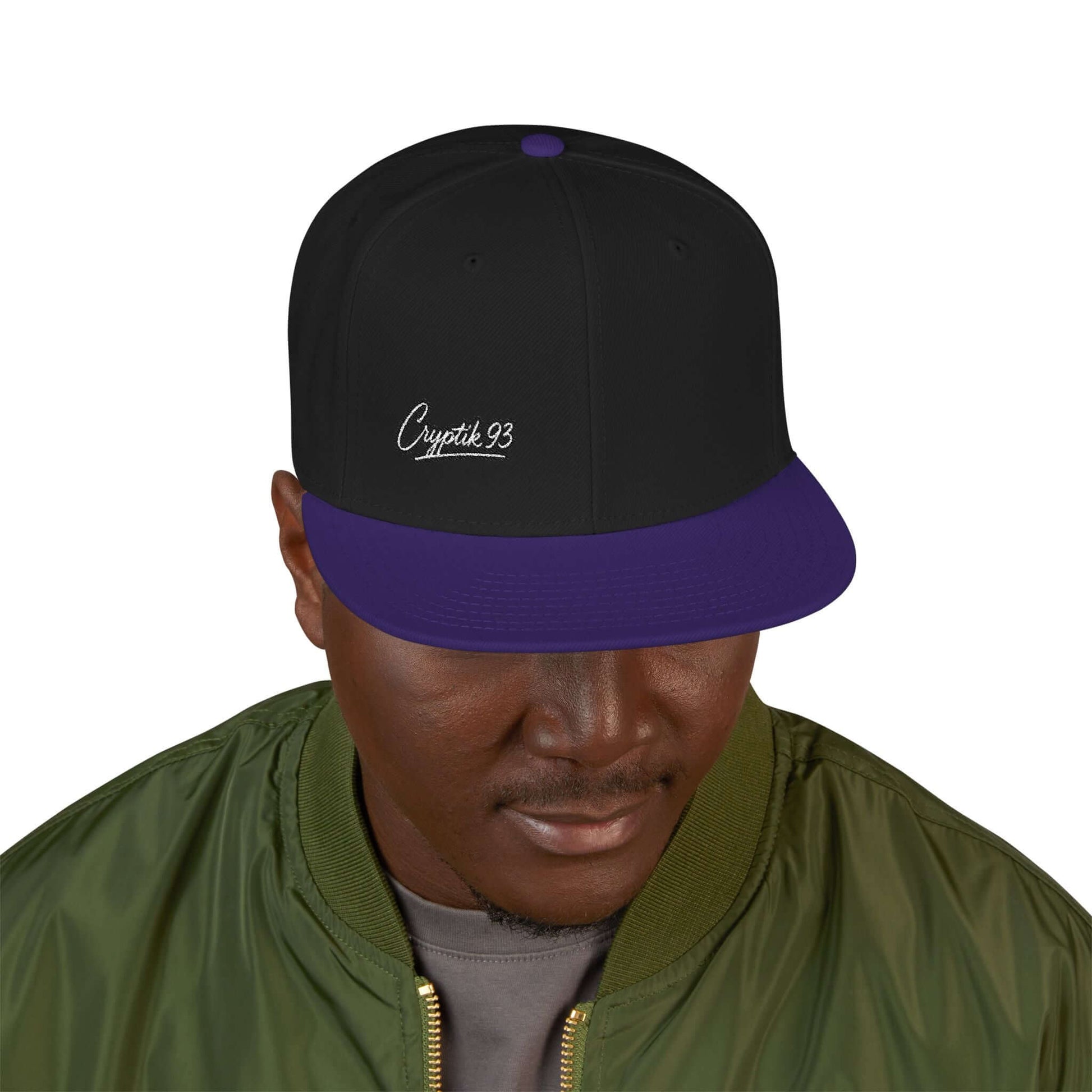 This structured, high-profile snapback brings a bold, urban edge to everyday wear. The six-panel crown and flat visor create a clean silhouette that sits confidently on the head, while the gray under-visor adds a subtle vintage touch. Crafted from an acrylic-wool blend, the cap holds its shape and feels sturdy without being stiff. The adjustable snap closure lets it fit a range of head sizes, and matching embroidered eyelets give the design a finished, cohesive look. Wear it low for a stealthy street vibe or tipped back for warm-weather hangouts—this cap moves with you.